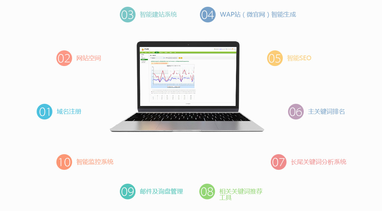 幫助企業從域名注冊、智能云服務器、智能建站系統、免費建站系統、WAP網站(微官網)智能生成、智能SEO工具、免費SEO軟件、效果
